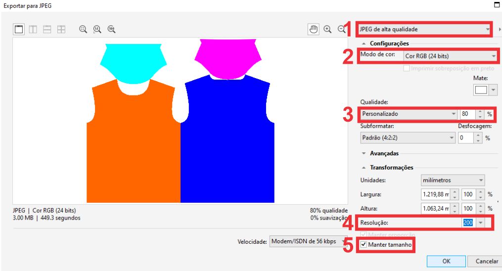 - O tamanho máximo para exportar um JPG no Corel é de 2,5 metros (250cm), qualquer medida acima disto será redimensionada pelo Corel.